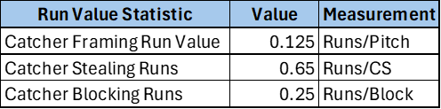 Why do organizations value pitch framing over throwing out runners stealing? This trade-off is made due to run value. Run value aims to measure the value of any single event in a baseball game. For instance, the average change in ability to score a run for converting a borderline ball into a strike is 0.125 (or 12.5 runs for every 100 events). The chart above shows the run values associated with framing, throwing out base stealers, and blocking, respectively. Although the value per event is the lowest for framing, this measurement is on a per-pitch basis. Over time, there will be significantly more framing events than that of blocking or caught stealing. Therefore, framing has the largest impact on run prevention (based on run value) over time.