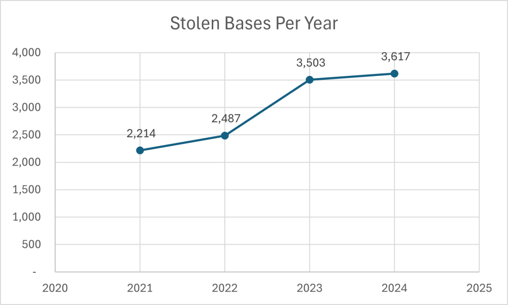 The number of stolen bases increased 39% between 2021 and 2024. The number had been increasing but shot up significantly in 2023 due to newly implemented rules including the pitch clock, larger bases, and pitcher disengagement limits. These rules, along with defensive shift restrictions (also implemented in 2023), are placing a larger emphasis on player athleticism at the major league level. As teams employ more athletic players, the number of stolen bases is likely to continue rising. If this trend continues, the gap between catcher run values for framing and throwing will likely narrow significantly.
